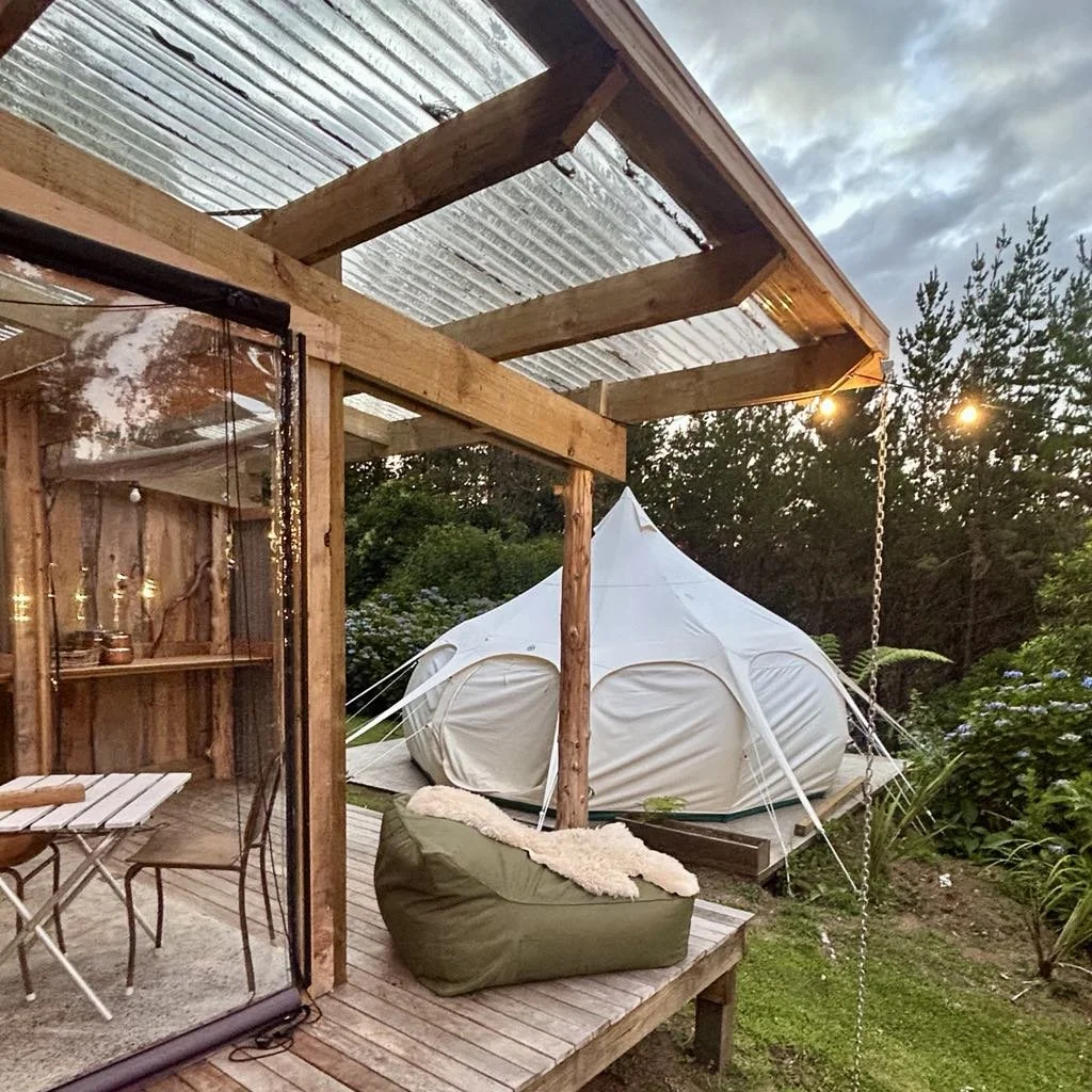 Glamp under the stars in our bell tent, to reconnect with nature and each other. Located in a beautiful setting overlooking our forest, the Glamping Tent site is a special space consisting of a large 5m Lotus Belle tent plus a separate lounge/kitchenette and a self-contained bathroom with a toilet and shower that is forest facing and makes you feel immersed in nature. This is luxury camping style accommodation with a queen bed, quality linen, and hanging space in the tent, plus a well equipped camp kitchen which includes a full fridge, Weber gas BBQ, electric fry pan, kettle and toaster. The rustic lounge/kitchenette is designed for relaxing and welcomes nature indoors with fold up plastic blinds. Lean back on the outdoor beanbag, gaze up at the moonlight sky and look out for shooting stars!